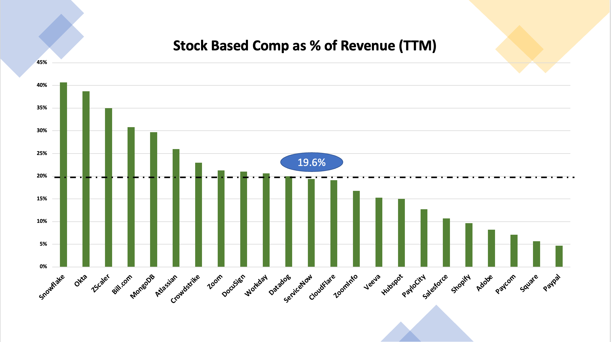 Overall, these 23 top SaaS firms are on average paying 19.6% of revenue in stock-based compensation. However, there’s some divergence here. On one end of the spectrum, companies like Snowflake, Okta pay a massive 35%+ revenue as SBC while on the other hand of the spectrum, Square and Paypal pay under 5% revenue as SBC to its employees.