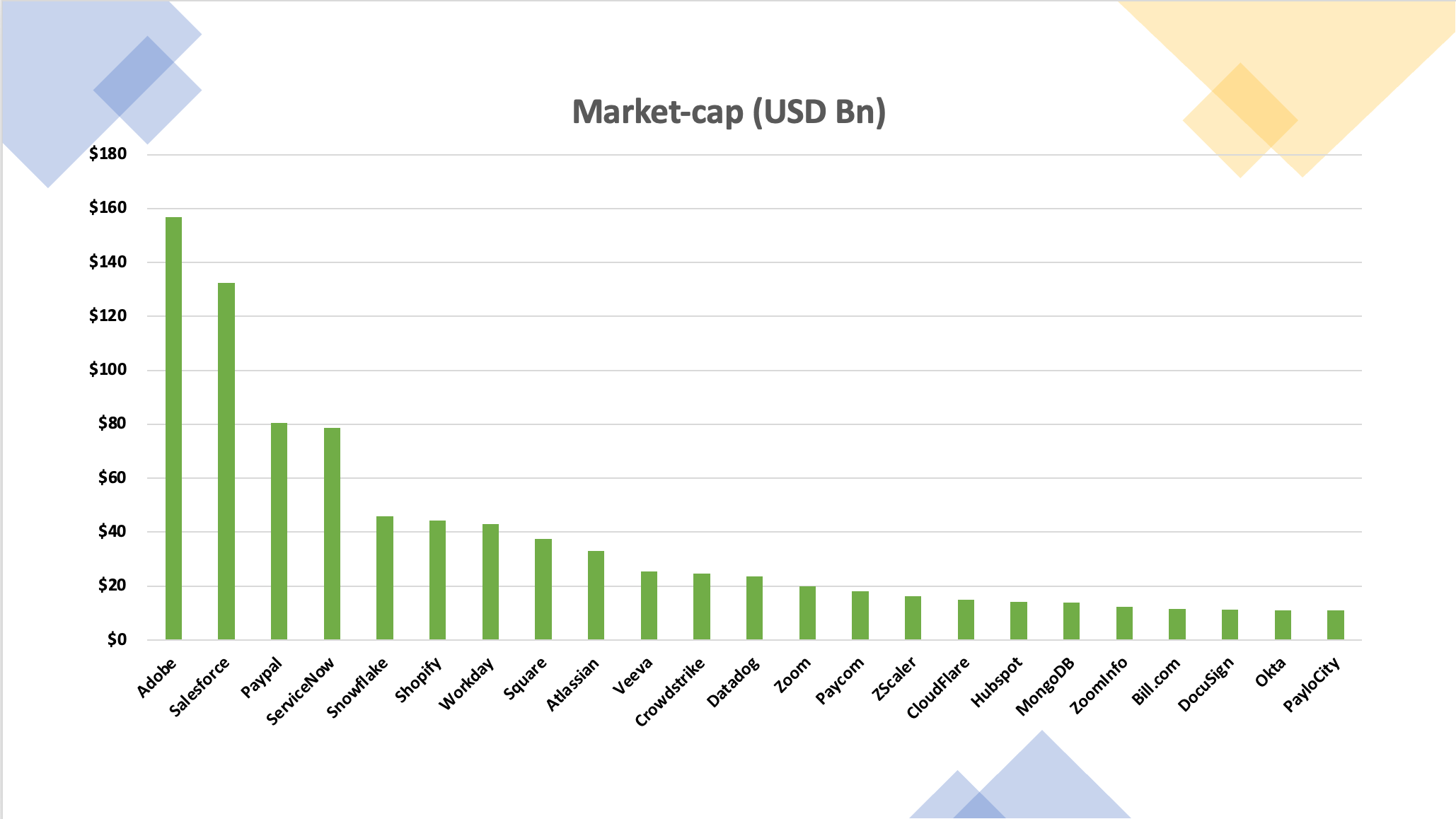 Let’s zoom into the top 23 publicly listed SaaS companies with a $10Bn+ market cap (List of companies) to understand more.