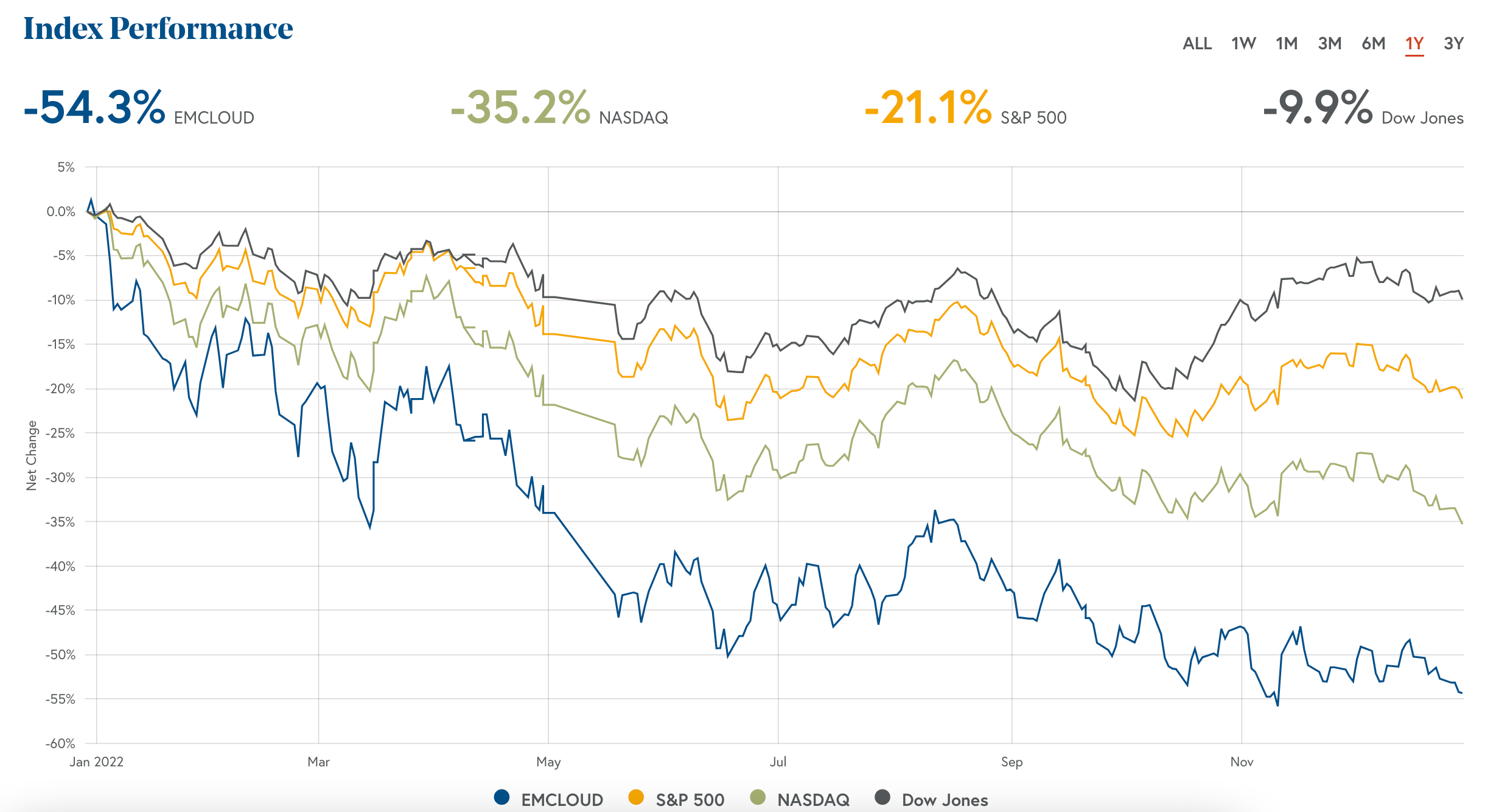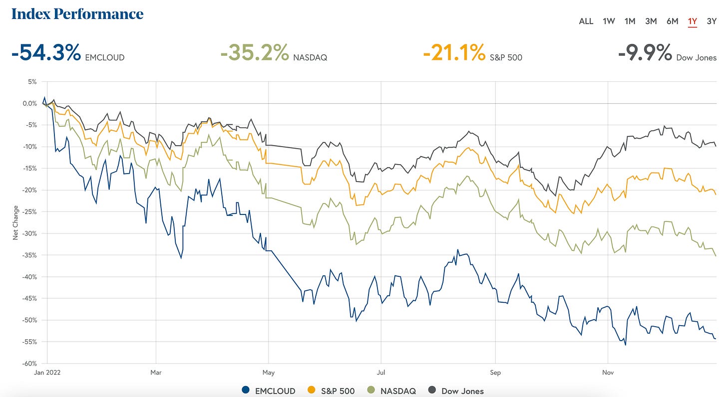 A closer look at the numbers reveals that while the broader S&P500 is down 21.1% in 1 year, the SaaS sector, as measured by the BVP Nasdaq Emerging Cloud ETF, is down 54.3%.