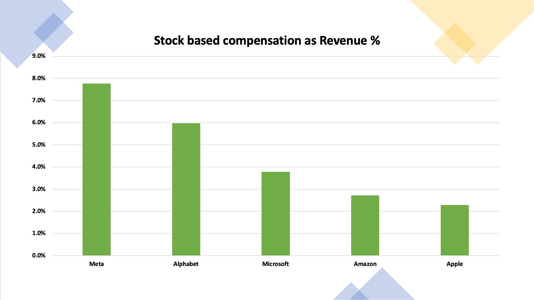 The Big Tech (Meta, Alphabet, Amazon, Apple, and Microsoft), are quite conservative when it comes to stock-based compensations. Unlike the SaaS firms paying 19.6% revenue as stock based comp, BigTech spent b/w 2-8% of revenue last year as SBCs. Since they have a better margin profile, the share of OCF paid as SBC is about 1/5th of what is paid by the SaaS firms (20% vs 104%).