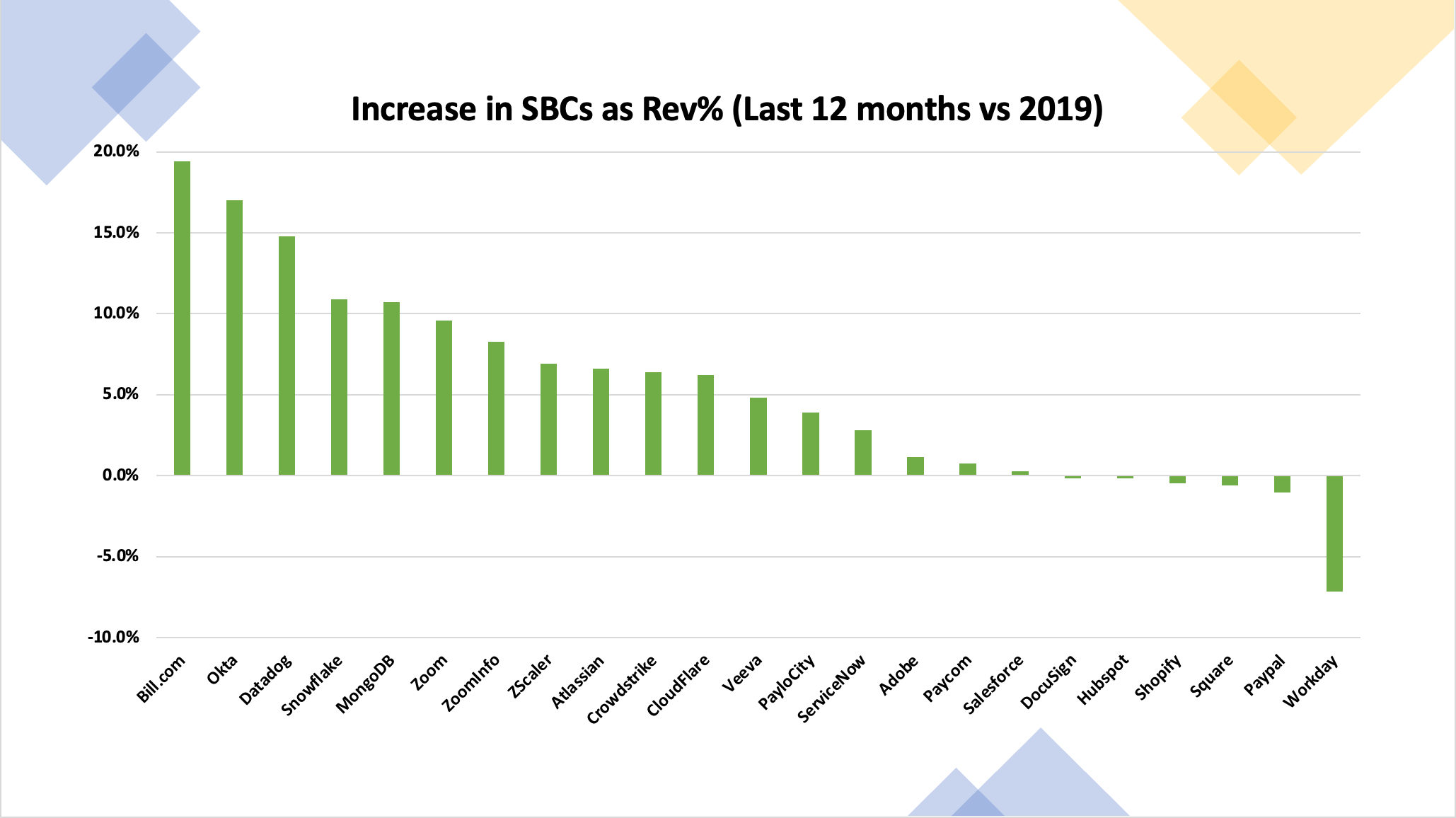 Specifically, 16 of the 23 SaaS companies paid more SBC as a share of their revenue in the last 12-months than they did in 2019, 4 of these increased SBC by more than 10%!