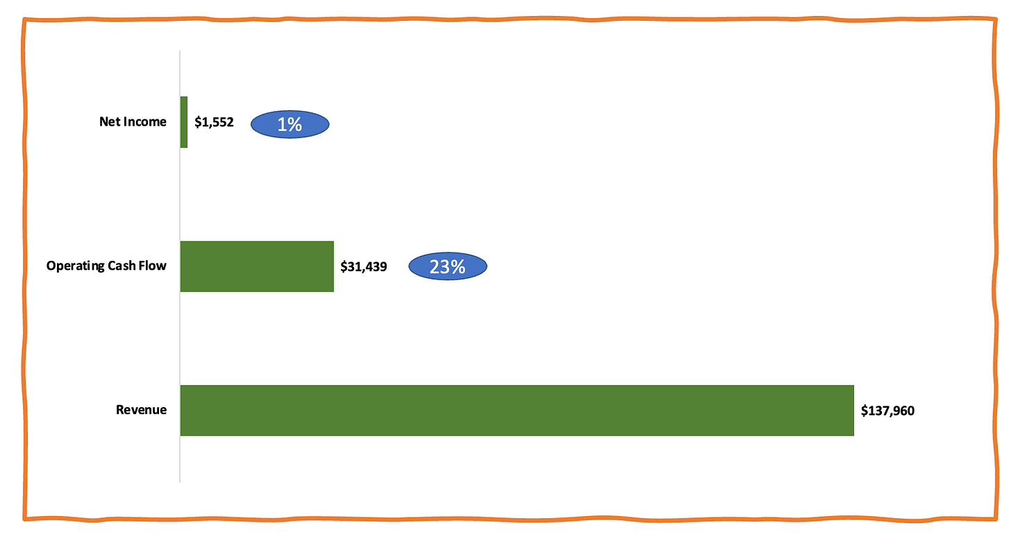 This dichotomy between 23% Operating Cash Flow to 1% Net Income (NI) is quite stark, and even more so for the asset-light SaaS companies, which don’t have depreciation expenses to bear with.